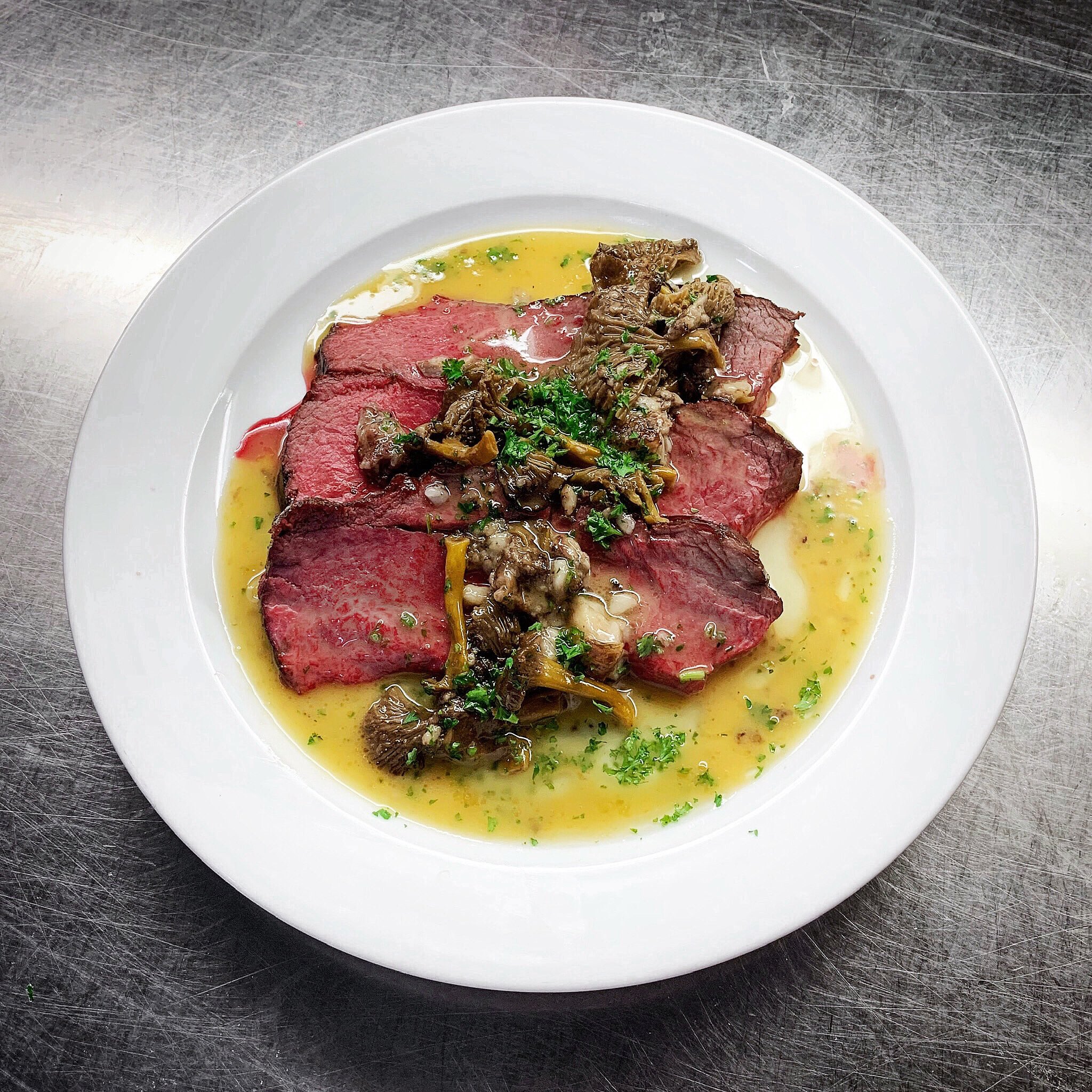 Roast Dexter, Chanterelles and Bone Marrow. Deeply pink, tender and melting. Rich and nourishing with late Autumn musk.