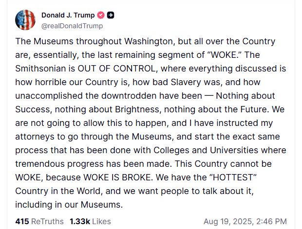 “The Smithsonian is OUT OF CONTROL, where everything discussed is how horrible our Country is, how bad Slavery was, and how unaccomplished the downtrodden have been — Nothing about Success, nothing about Brightness, nothing about the Future,” the president wrote Tuesday in a Truth Social post.